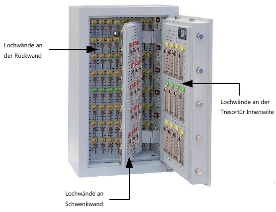Gerade bei Mehrmarken Autohäusern eignen sich die Lochwände. Je nach Bedarf und technischer Machbarkeit können so die Tresortüre, Seitenwände und die Tresorrückwand damit ausgestattet werden. Durch das Raster können Sie so individuell die Haken im Tresor setzen und auch wieder verstellen. Auch in der Wahl der Hakenlänge können Sie verschiedene Längen sich aussuchen, speziell wenn Sie mehrere Schlüssel für ein Fahrzeug ablegen möchten. Sprechen Sie uns gerne an.