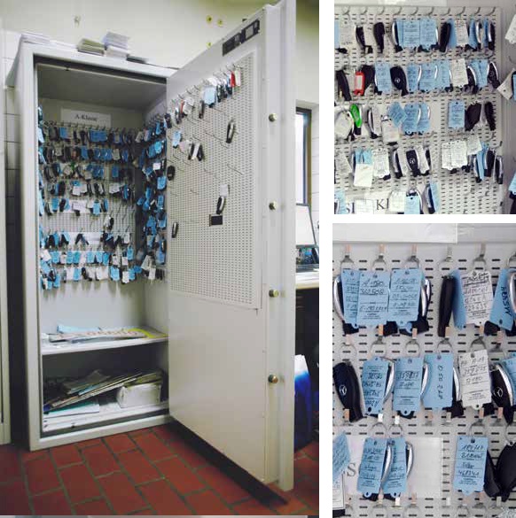 Für die besonderen Anforderungen von Kfz Werkstätten, Autohäusern und Autovermietungen bieten wir vom Institut-Neuscheler spezielle Sicherungssysteme für eine perfekte Schlüsselorganisation in vielen Größen, Ausführungen und Sicherheitsstufen. Durch flexibel einzurichtende Schlüsselhakenleisten, in die die Schlüsselhaken von der Höhe und dem seitlichen Abstand variabel eingehängt werden können, lassen sich auch große Schlüssel und Transponder problemlos im Tresor unterbringen. Auch Schlüsselmanagement Systeme zum Einbau in Schlüsseltresore gehören zu unserem Produktprogramm. Fragen Sie gerne bei uns nach.