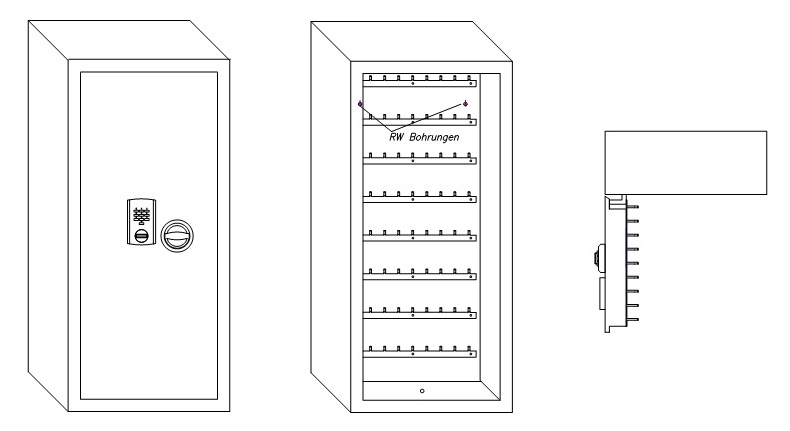 von oben je 8 Reihen 10er Hakenleisten (Hakenlänge: 40mm Abstand der Haken voneinander: 40mm übereinander: 110mm von HL zu HL) auf der Rückwand. Zusätzlich eine ausklappbare Zwischenwand mit je 8 Stück 10er Hakenleisten beidseitig bestückt. Ergänzend auf dem TV-Blech der Tresortür 6 Stück 10er Hakenleisten. Abm, 1500x600x500mm, Gewicht 420Kg